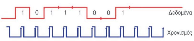 Η μέθοδος αυτή μπορεί να χρησιμοποιηθεί όταν υπάρχει καλωδιακή σύνδεση μεταξύ των συστημάτων αλλά δεν μπορεί να χρησιμοποιηθεί όταν τα συστήματα βρίσκονται σε μεγάλη απόσταση. Για την αντιμετώπιση αυτού του προβλήματος στη σύγχρονη μετάδοση δεδομένων (synchronous data transmission) μαζί με τα δεδομένα μεταδίδεται και το σήμα χρονισμού.
