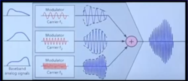 Η πολυπλεξία διαίρεσης συχνότητας (Frequency Division Multiplexing - FDM) είναι μία τεχνική που χρησιμοποιείται κυρίως για τη μετάδοση αναλογικών σημάτων. Το εύρος ζώνης47 του τηλεπικοινωνιακού καναλιού διαιρείται σε ζώνες συχνοτήτων που ονομάζονται κανάλια. Η μετάδοση των σημάτων γίνεται ταυτόχρονα σε όλα κανάλια που έχουν οριστεί.