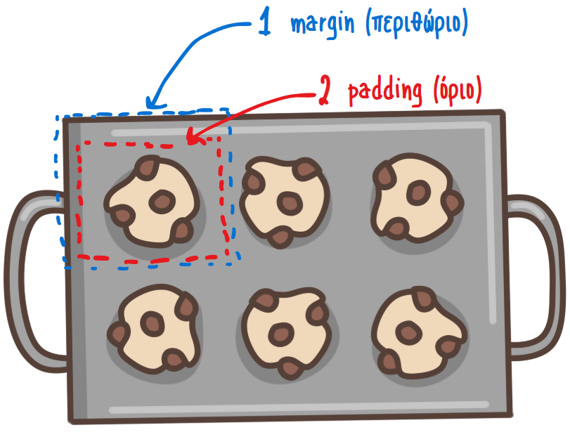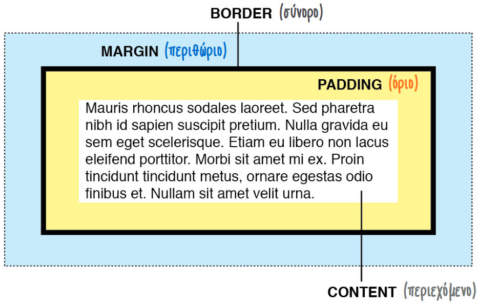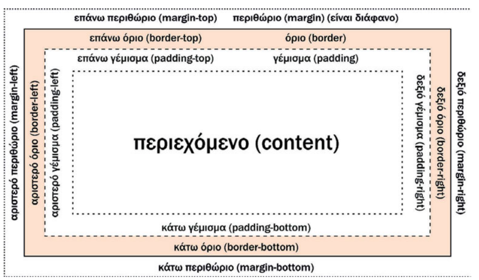 border:1px solid black; | Η ενότητα κειμένου θα έχει περίγραμμα συμπαγούς μαύρης γραμμής, πάχους 1px. Άλλες μορφές περιγράμματος είναι οι dashed, ridge, dotted, κ.λπ. |
